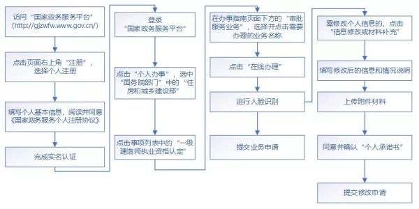 自2020年9月1日起,申请人将统一通过“国家政务服务平台”申报一级建造师初始、增项、重新注册等业务。申请人在国家政务服务平台注册账号并完成实名认证后,通过人脸识别进入所选事项办理页面。若需修改个人信息的,通过“个人信息修改或补充材料”页面,提出申请。(具体申报流程见下图)